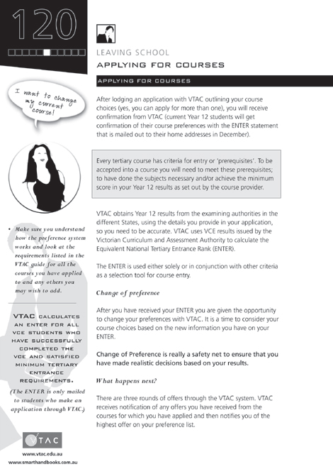Make sure you understand how the preference system works and look at the requirements listed in the VTAC guide for all the courses you have applied to and any others you may wish to add. -