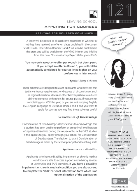 Special Entry Schemes vary from institution to institution and information on these can be found at the front of each institutional entry in your VTAC guide.